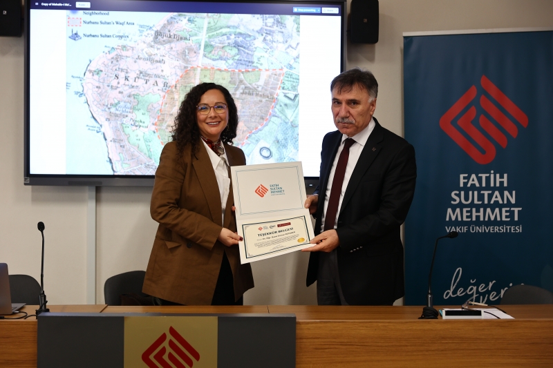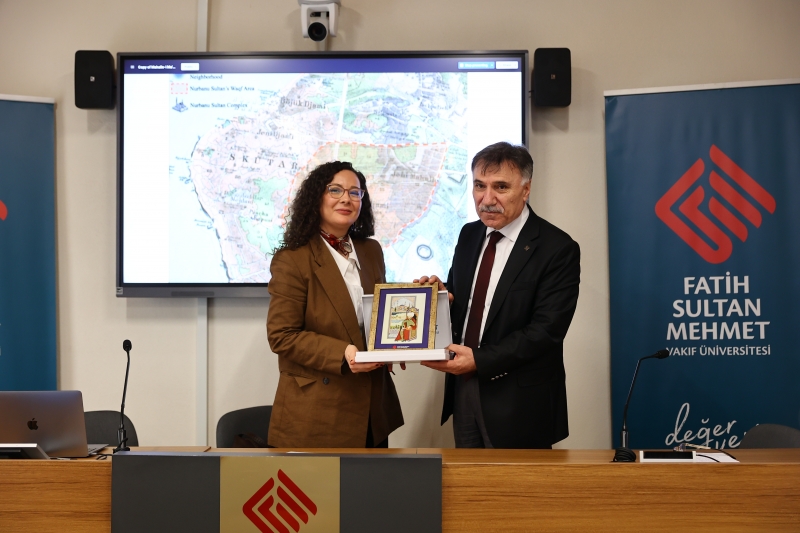 Programın sonunda FSMVÜ Rektör yardımcı ve Vakıf Kültürü ve Medeniyeti Uygulama ve Araştırma Merkezi müdürü Prof. Dr. Turan GÖKÇE tarafından, Dr. Emine ÖZTANER’e katılımlarından ötürü bir teşekkür pilaketi ve hediye takdim edildi.