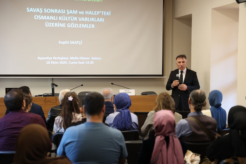 FSMVÜ Vakıf Kültürü ve Medeniyeti Uygulama ve Araştırma Merkezi ile Vakıflar Genel Müdürlüğü’nün düzenlediği Prof. Dr. Suphi Saatçi’nin “Savaş Sonrası Şam ve Halep’teki Osmanlı Kültür Varlıkları Üzerine Gözlemler” başlıklı konferansı, 10 Ekim 2025 Cuma günü FSMVÜ Ayasofya Yerleşkesi Molla Hüsrev Salonu’nda gerçekleştirildi.