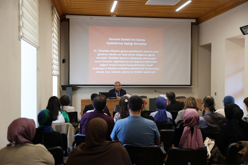 Savaş öncesi ve sonrası birçok kez bölgeye giderek kültür mirası eserlerini inceleyen Prof. Dr. Saatçi, konuşmasına Osmanlı Devleti’nin güney bölgelerinde, özellikle Mekke, Medine, Kudüs, Şam ve Halep’te yaptığı imar faaliyetlerini hatırlatarak başladı. Mekke ve Medine’de kervansaray, han, hamam, çeşme ve revakların inşa edildiğini; Kudüs’te önemli onarımlar ve imaretler yapıldığını belirtti. Şam’da Kanuni Sultan Süleyman adına büyük bir menzil külliyesi, Halep’te Hüsreviye ve Adiliye Külliyeleri inşa edildiğini söyledi.